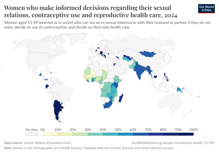 United Nations Population Fund – processed by Our World in Data. “Women who make informed decisions regarding their sexual relations, contraceptive use and reproductive health care” [dataset]. United Nations Population Fund, “Data from multiple sources” [original data]. Retrieved January 9, 2026 from https://chrome-plugin.owid.pages.dev/grapher/women-informed-decisions-health-sexual-relations