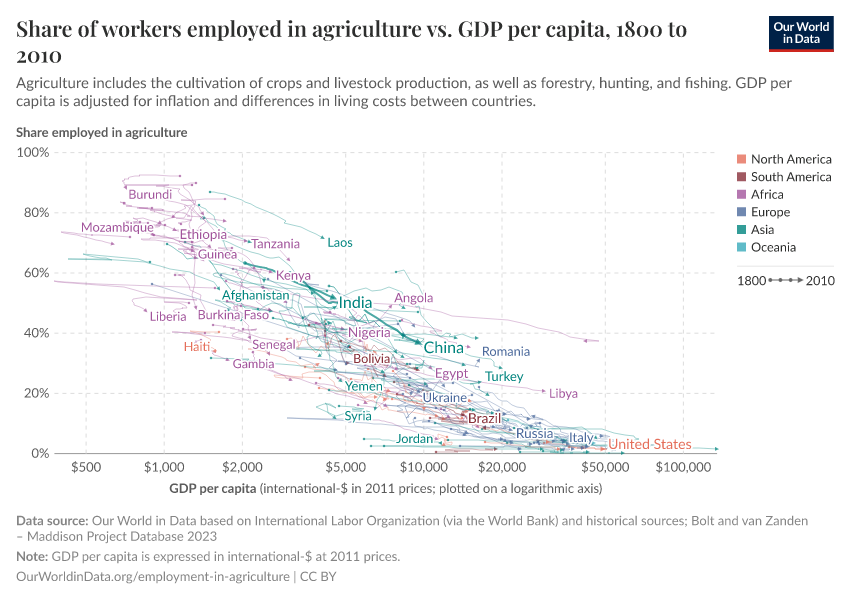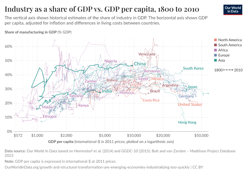 One way to study the process of “structural transformation” across countries is to track how employment changes across sectors in the economy. The below chart does this, plotting the share of industry in total employment (vertical axis) against GDP per head (horizontal axis). This graph is a “connected scatter plot” — each line shows the trajectory that a country followed over time along these two dimensions. Data is available for a selection of more than 40 countries, across all continents.