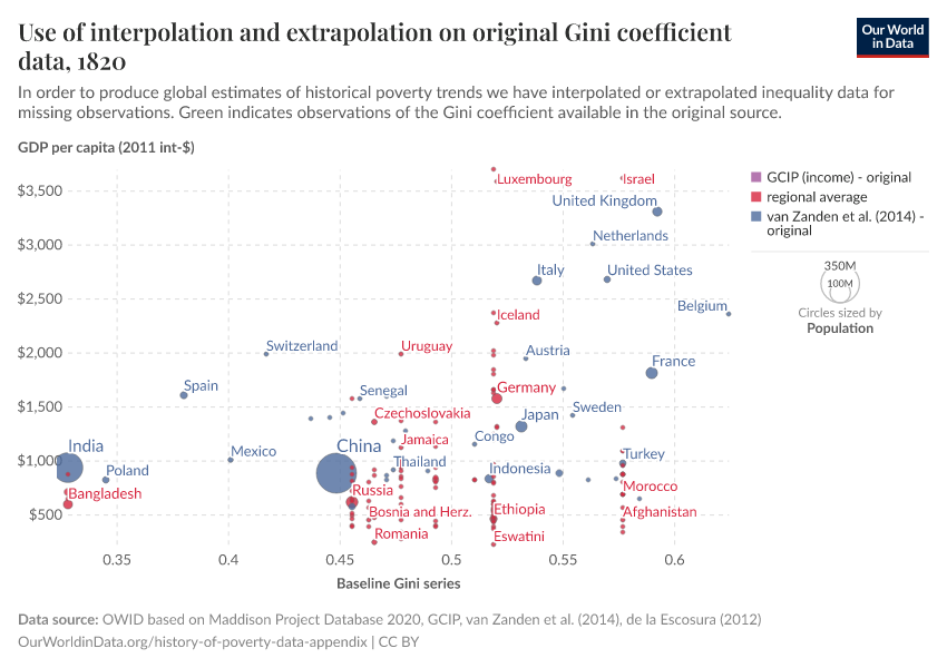 - For the purposes of replication, the fully interpolated dataset is shown in the two charts below. Both charts show the same data points: GDP per capita along the horizontal axis, Gini coefficient along the vertical axis and population as bubble size. The colour indicates the source and treatment used to arrive at the GDP per capita data points and the Gini data points respectively.