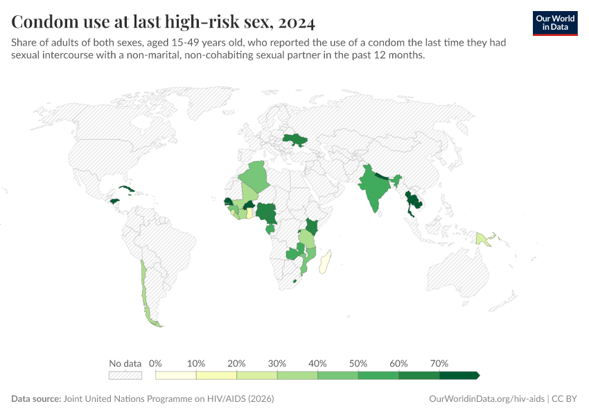 Sexual transmission can be prevented through condom use (both in heterosexual and homosexual relationships). In the charts here, we see the prevalence of condom use, particularly in cases of “high-risk sex”, which is defined by this data’s source as non-marital, non-cohabiting sexual partner.