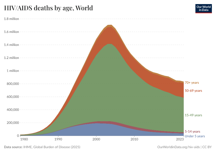 In the visualization, we see the global number of deaths from HIV/AIDS in recent decades – this is shown by age group. In the mid-2000s, global deaths peaked at almost 2 million per year.