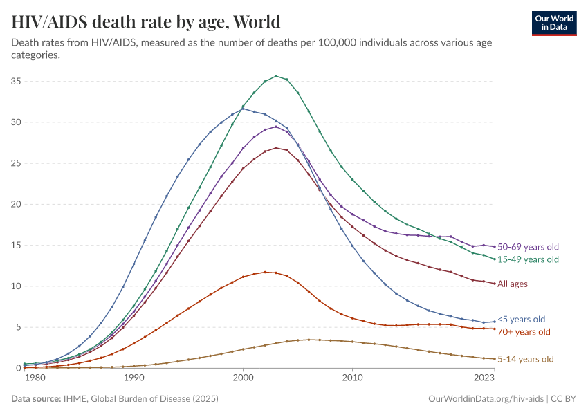 In the chart, we show death rates by age group. Here we see that the most at-risk group is younger adults (15 to 49-year-olds). Since HIV is primarily a sexually transmitted infection, where unsafe sex is a primary risk factor, this is what we would expect.