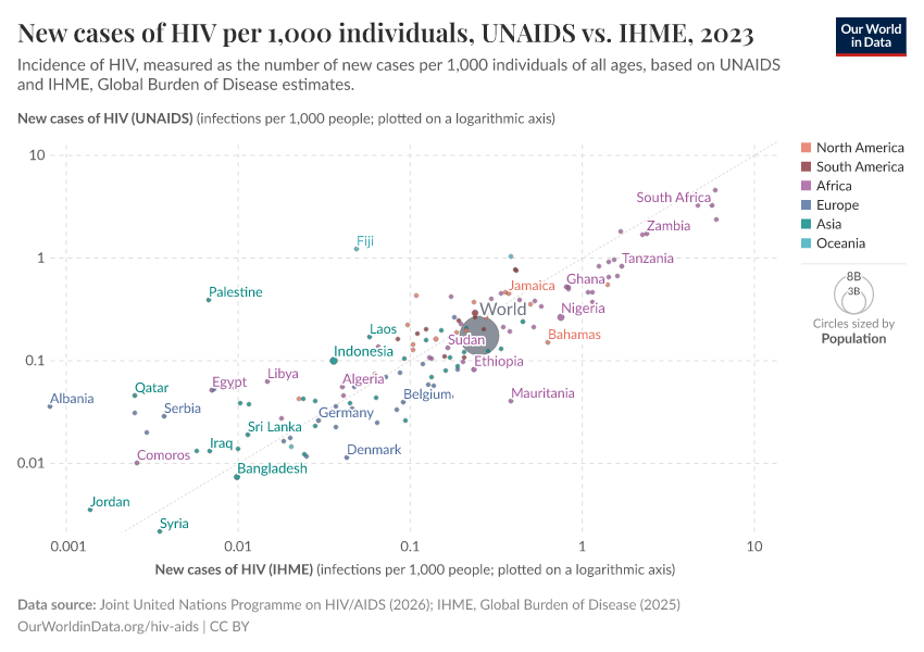 Several sources publish estimates on HIV and AIDS. Two of the most established sources, presented on this page, are UNAIDS and the Institute of Health Metrics and Evaluation (IHME). The charts below show a comparison of these two sources' estimates.