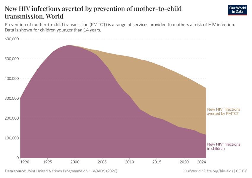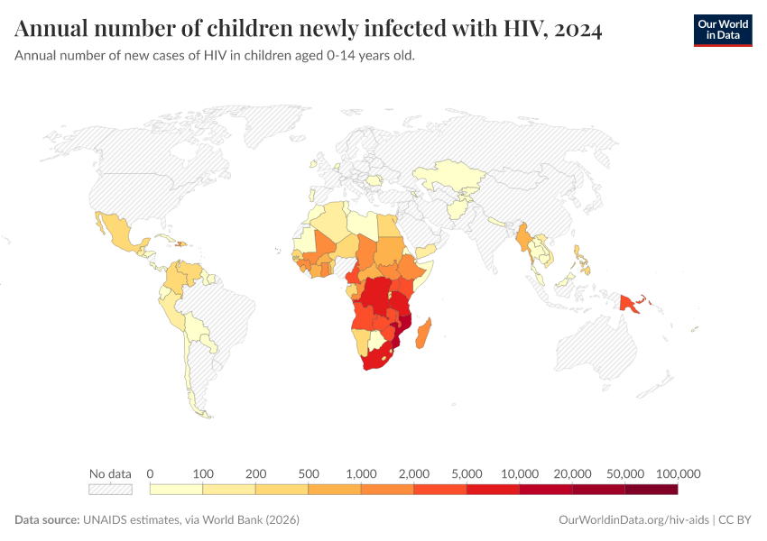 The map shows the total number of children newly infected with HIV yearly. Globally — with similar trends at national levels — the number of new infections in children peaked around the early 2000s (with over 500,000 new infections per year globally), followed by a rapid decline over the last decade.