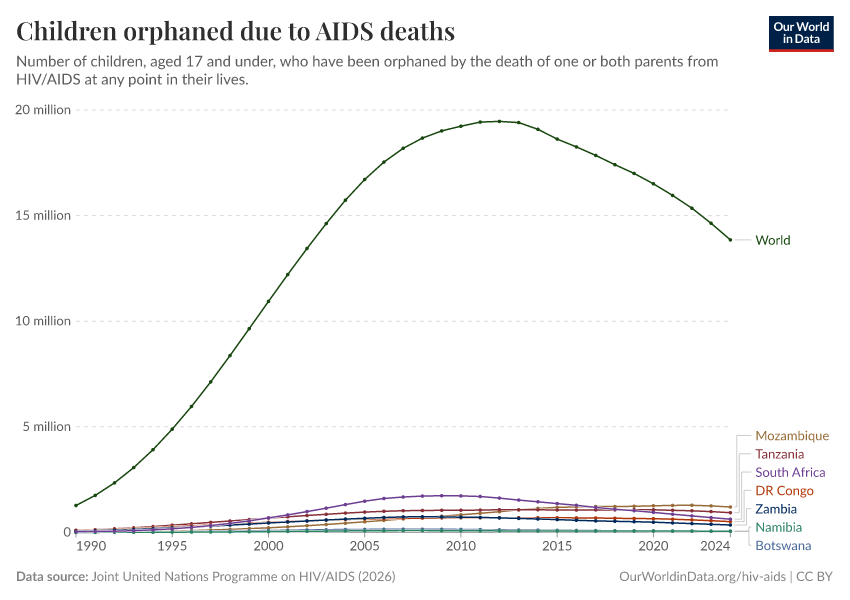 Some children have lost either one or both parents to AIDS. This does not necessarily imply that children orphaned by AIDS have HIV themselves (although, in some cases, HIV has been transmitted from mother to child). The chart shows the number of children (aged 17 and under) orphaned from AIDS deaths.