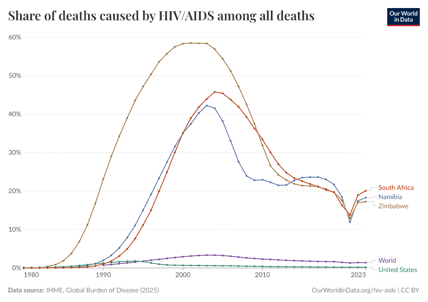 Today, the share of deaths remains high: more than 1 in 5 deaths in some countries are caused by HIV/AIDS. But in the past, this share was even higher.