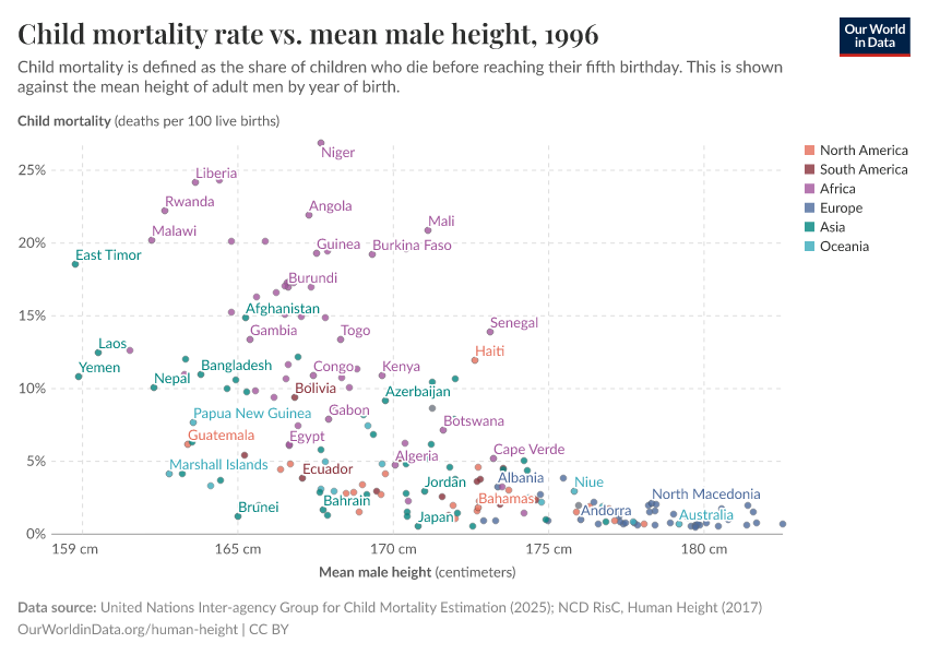 The data shown here comes from a global study, published by the NCD Risk Factor Collaboration (NCD-RisC) in 2016.4 This dataset is based on both demographic and health surveys as well as academic studies. It reports the estimated average (mean) height for adults by their year of birth, meaning that it only includes estimates for those who have reached the age of 18.