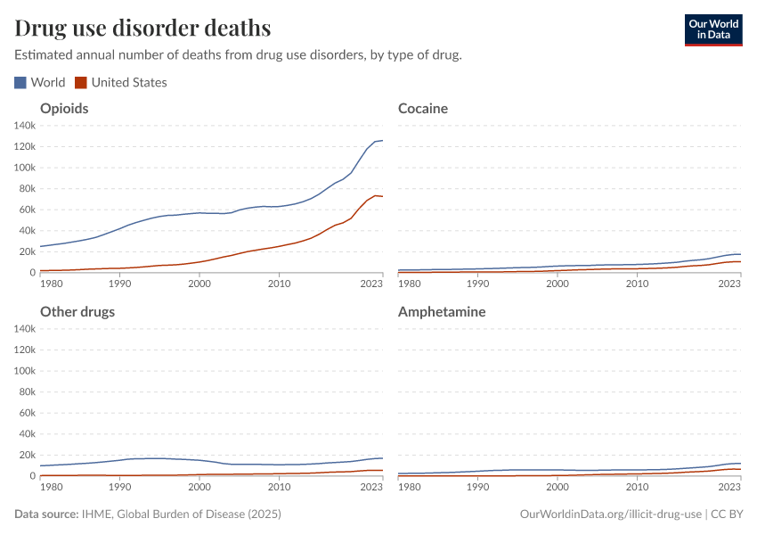 Hannah Ritchie, Pablo Arriagada, and Max Roser (2022) - “Opioids, Cocaine, Cannabis, and Other Illicit Drugs” Published online at OurWorldinData.org. Retrieved from: 'https://chrome-plugin.owid.pages.dev/illicit-drug-use' [Online Resource]BibTeX citation