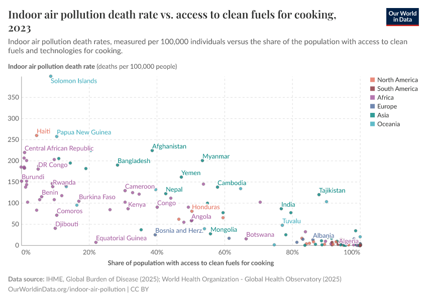 Low-income households tend to rely on solid fuels for cooking because cleaner fuels are either unavailable or too expensive. We, therefore, see a strong link between death rates from indoor air pollution and access to clean fuels for cooking.