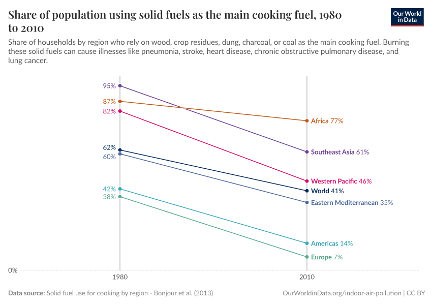 The chart shows that the world is making progress in this direction. In 1980, almost two-thirds of the world’s population used solid fuels for their cooking. Thirty years later, this is down to around 40%. The chart also shows that it is a problem associated with poverty: In richer Europe and North America, the share is much lower than in the rest of the world, and in the high-income countries of the world, the use of solid fuels is entirely a thing of the past.