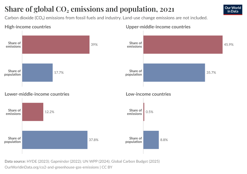 Instead, we see that high- and upper-middle income countries account for a much larger share of emissions than their population. Despite being home to just under half of the world population, they emit more than 80% of world’s CO2.