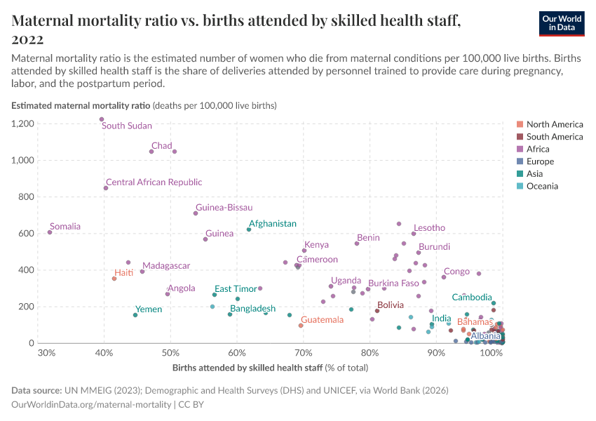 In the second chart, we see the relationship between the maternal mortality rate and the share of births which are attended by skilled health staff.