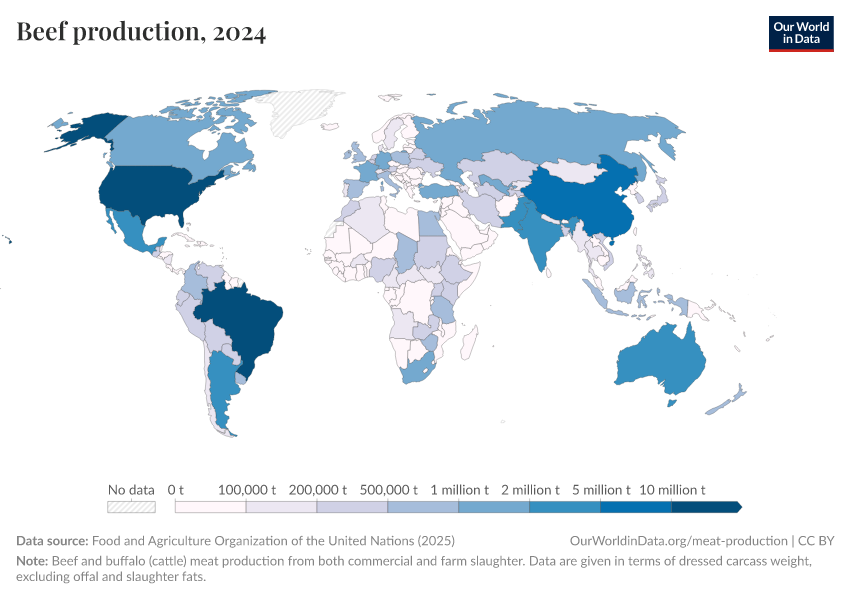 In the chart, we see the global production of cattle (beef and buffalo) meat. Globally, cattle meat production has more than doubled since 1961.