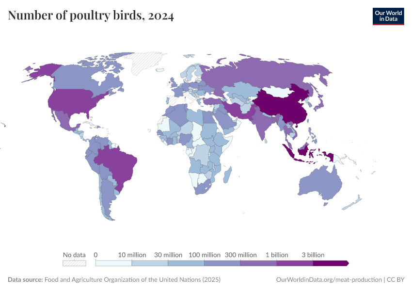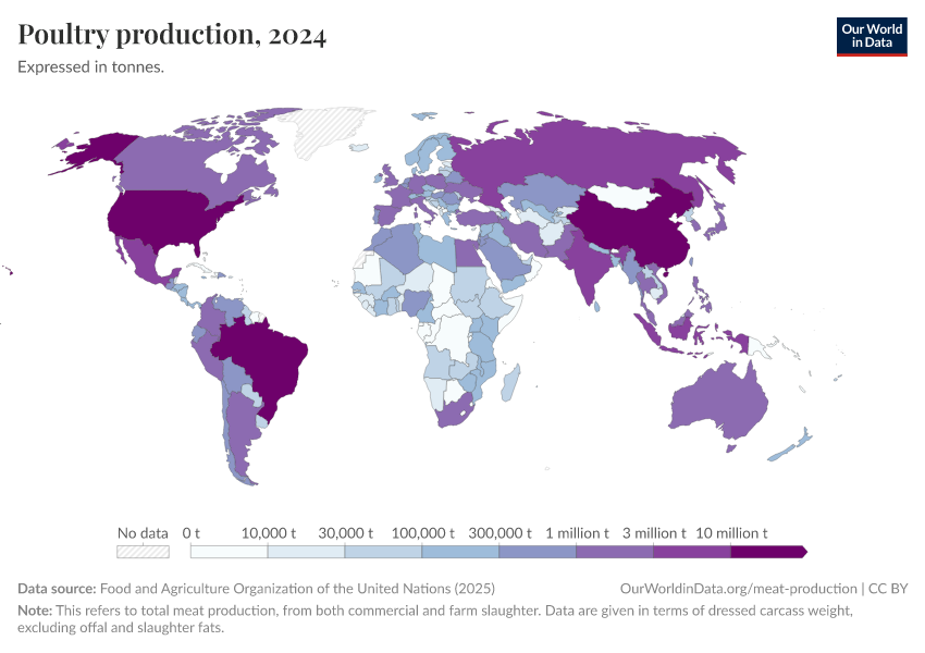Global production of poultry meat has seen a dramatic rise over the last 50 years, multiplying significantly since 1961. Global trends in poultry production are shown in the chart.
