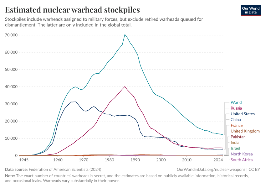 Bastian Herre, Pablo Rosado, and Max Roser (2024) - “Nuclear Weapons” Published online at OurWorldinData.org. Retrieved from: 'https://chrome-plugin.owid.pages.dev/nuclear-weapons' [Online Resource]BibTeX citation