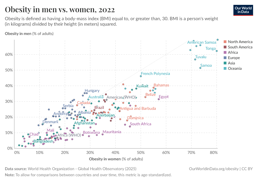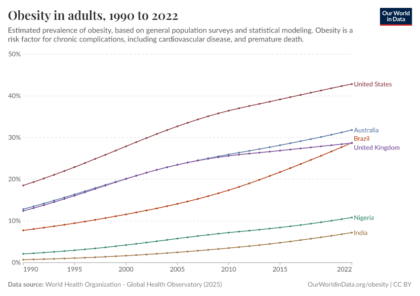 Hannah Ritchie and Max Roser (2017) - “Obesity” Published online at OurWorldinData.org. Retrieved from: 'https://chrome-plugin.owid.pages.dev/obesity' [Online Resource]BibTeX citation