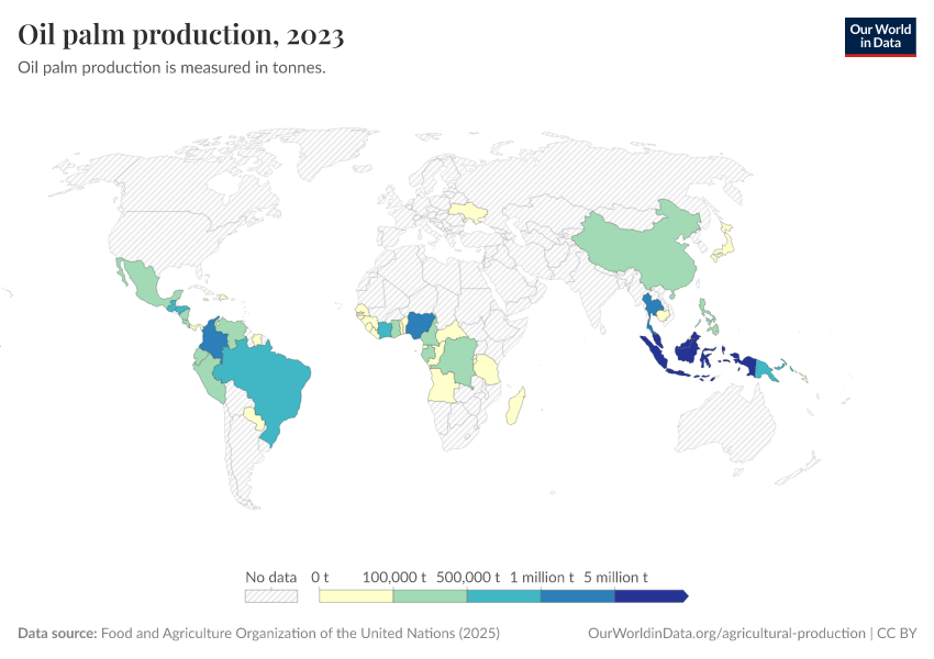 Oil palm is a tropical plant species. It thrives on high rainfall, adequate sunlight, and humid conditions – this means the best growing areas are around the equator.4 Palm oil is therefore grown in many countries across Africa, South America, and Southeast Asia. In the map, we see the distribution of production across the world.