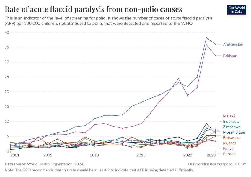 If a country is detecting very few cases of AFP overall, then it suggests it’s not screening enough for paralysis. So, to measure how much screening is ongoing, we can look at how many cases of AFP that are not caused by polio are being detected. This is called the non-polio AFP rate.