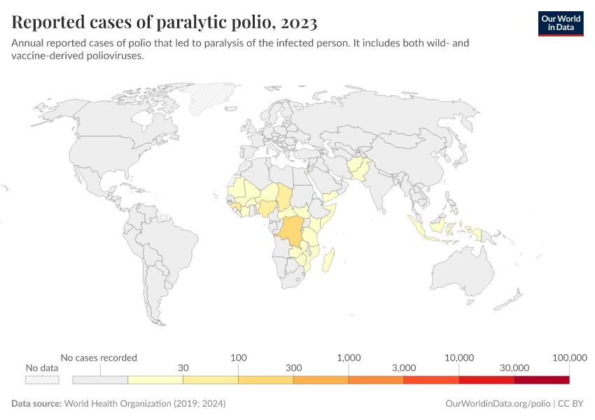 Meanwhile, in the countries shown in yellow – India, the Philippines, and Malaysia, as well as many countries in Africa – there was inadequate testing to confirm whether potential cases had polio.