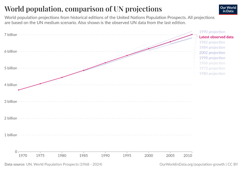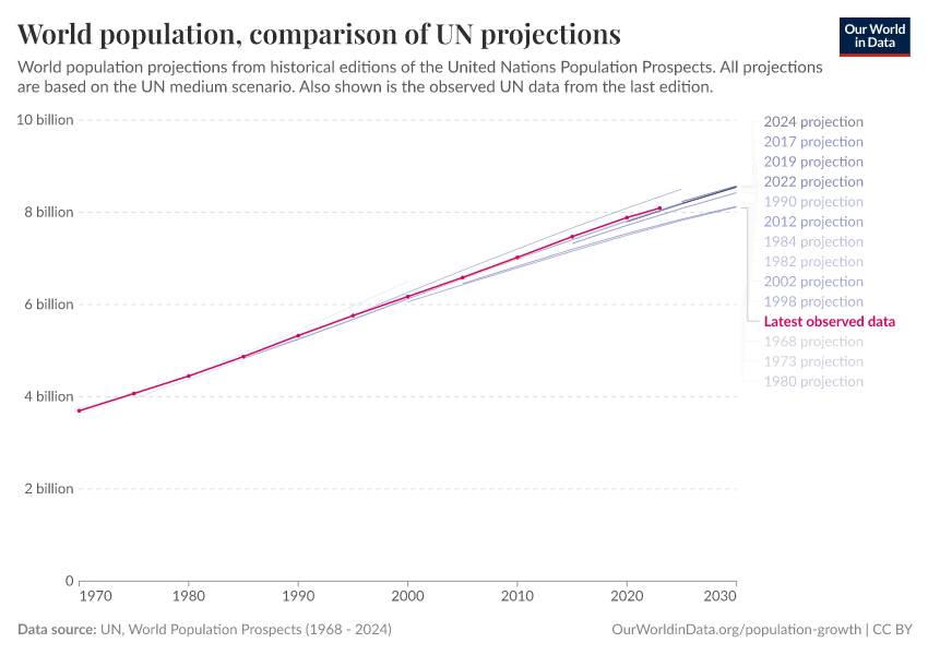 Hannah Ritchie (2023) - “The UN has made population projections for more than 50 years – how accurate have they been?” Published online at OurWorldinData.org. Retrieved from: 'https://chrome-plugin.owid.pages.dev/population-projections' [Online Resource]BibTeX citation
