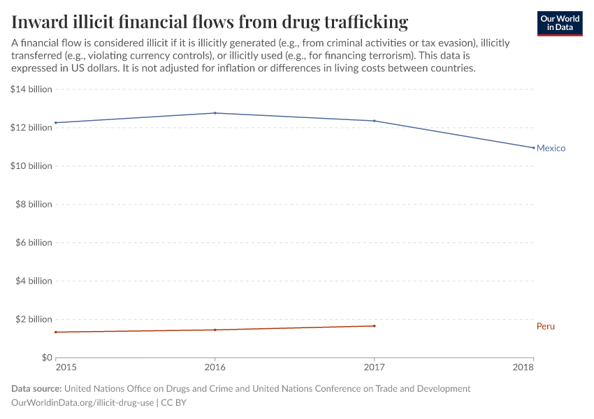 There is currently limited data availability for this indicator. For a small number of countries sata regarding illicit financial flows from drug trafficking is available and is shown here.