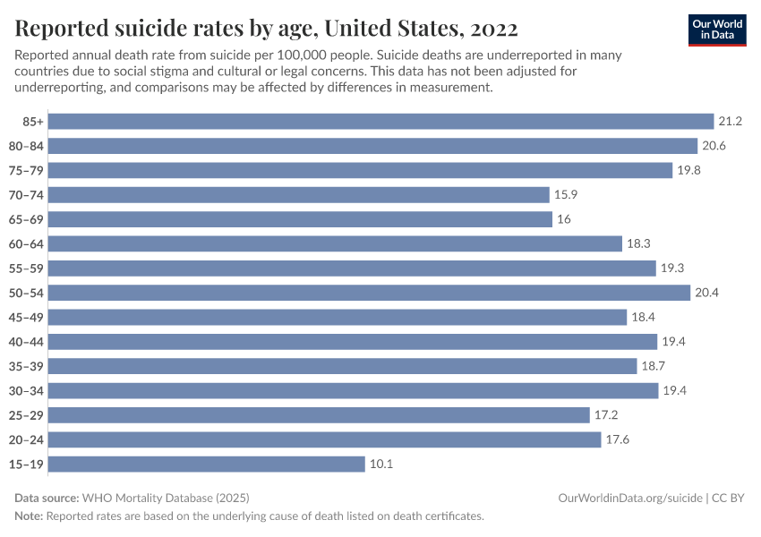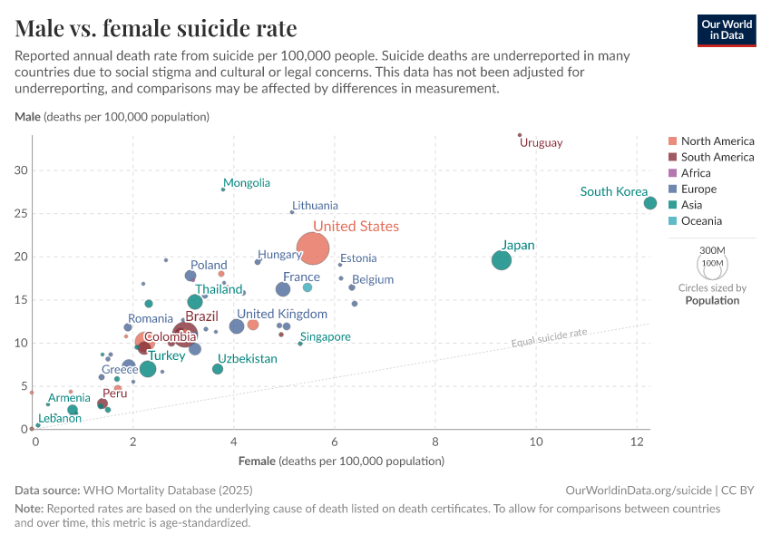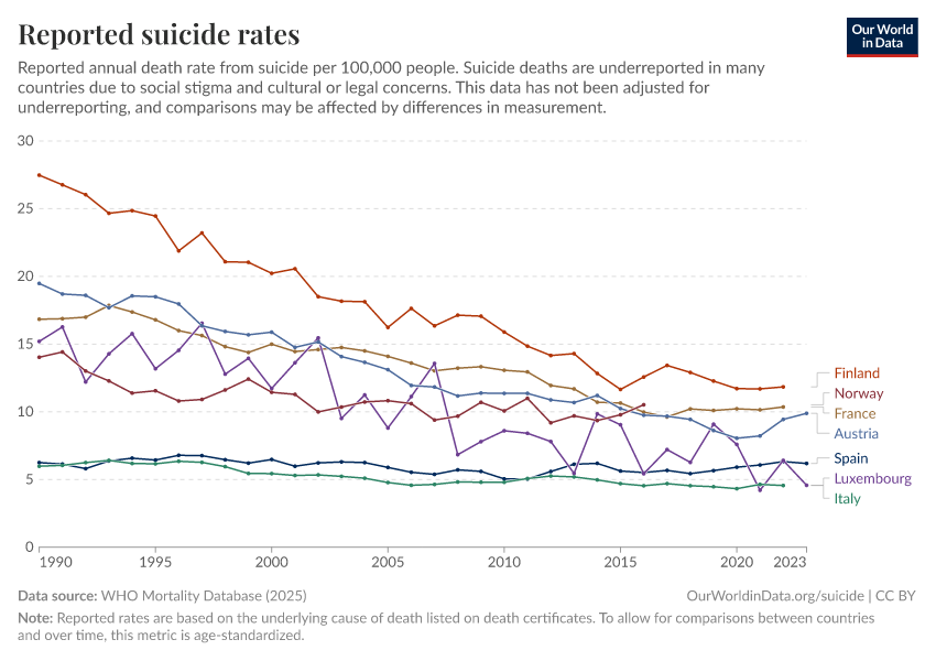 Saloni Dattani, Lucas Rodés-Guirao, Hannah Ritchie, Max Roser, and Esteban Ortiz-Ospina (2023) - “Suicides” Published online at OurWorldinData.org. Retrieved from: 'https://chrome-plugin.owid.pages.dev/suicide' [Online Resource]BibTeX citation