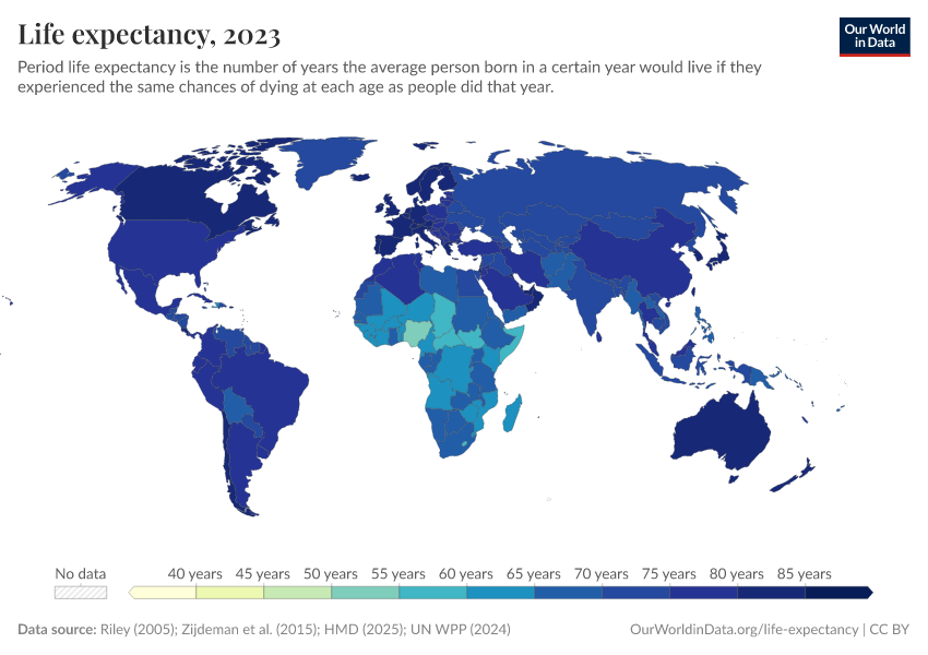 On this page, you will find global data and research on life expectancy and related measures of longevity: the probability of death at a given age, the sex gap in life expectancy, lifespan inequality within countries, and more.