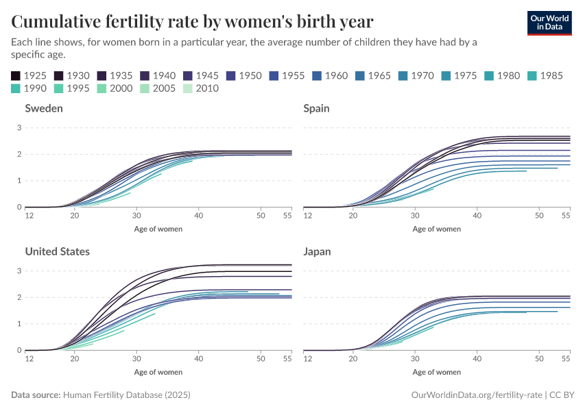 Now you can see that in Sweden, although the curves are pushed towards the right (meaning that childbirths have been delayed), eventually, each cohort reached a cumulative fertility rate of 2 births per woman. This reflects a tempo effect but not a quantum effect.