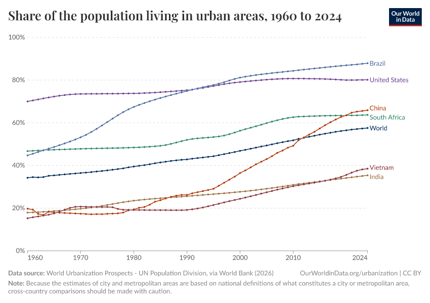 Hannah Ritchie, Veronika Samborska, and Max Roser (2024) - “Urbanization” Published online at OurWorldinData.org. Retrieved from: 'https://chrome-plugin.owid.pages.dev/urbanization' [Online Resource]BibTeX citation