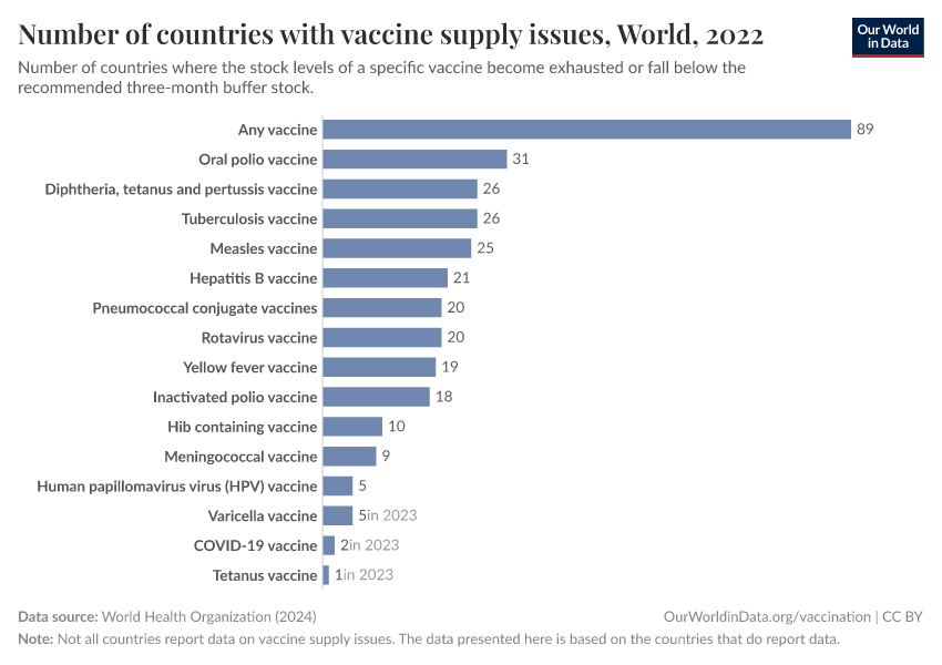 The chart shows that around 90 countries reported shortages of at least one vaccine in 2022. The most common were oral polio, DTP, and BCG vaccines — critical for preventing polio and tuberculosis. Even vaccines for diseases like rotavirus (the most common cause of death from diarrheal disease) and pneumococcal disease faced shortages, though to a lesser extent.