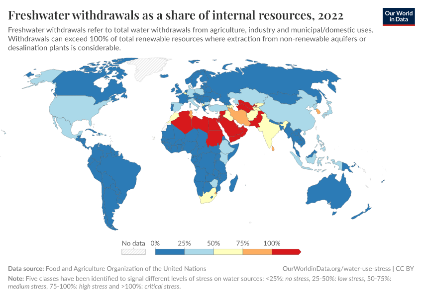 The visualization provides a measure of levels of water stress across the world. This is measured based on freshwater withdrawals as a share of internal (renewable) resources. The Food and Agriculture Organization of the United Nations categorizes water stress in the following ways: if withdrawals are less than 25 percent of resources, then a country has no water stress; 25-50 percent is low stress; 50-75 percent is medium; 75-100 percent high stress; and greater than 100 percent is critical stress.3