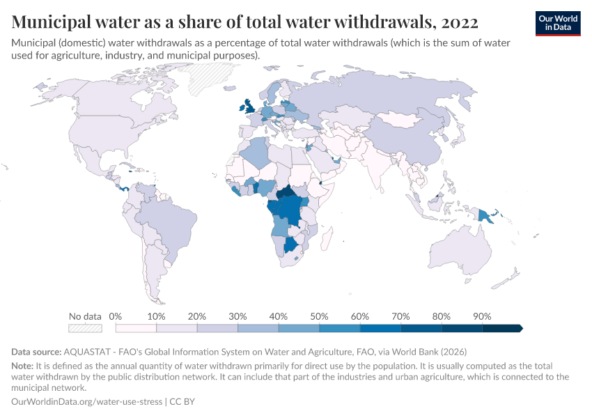 Municipal uses as a share of total water withdrawals across the world are shown in the chart. The majority of countries use less than 30 percent of withdrawals for domestic purposes.